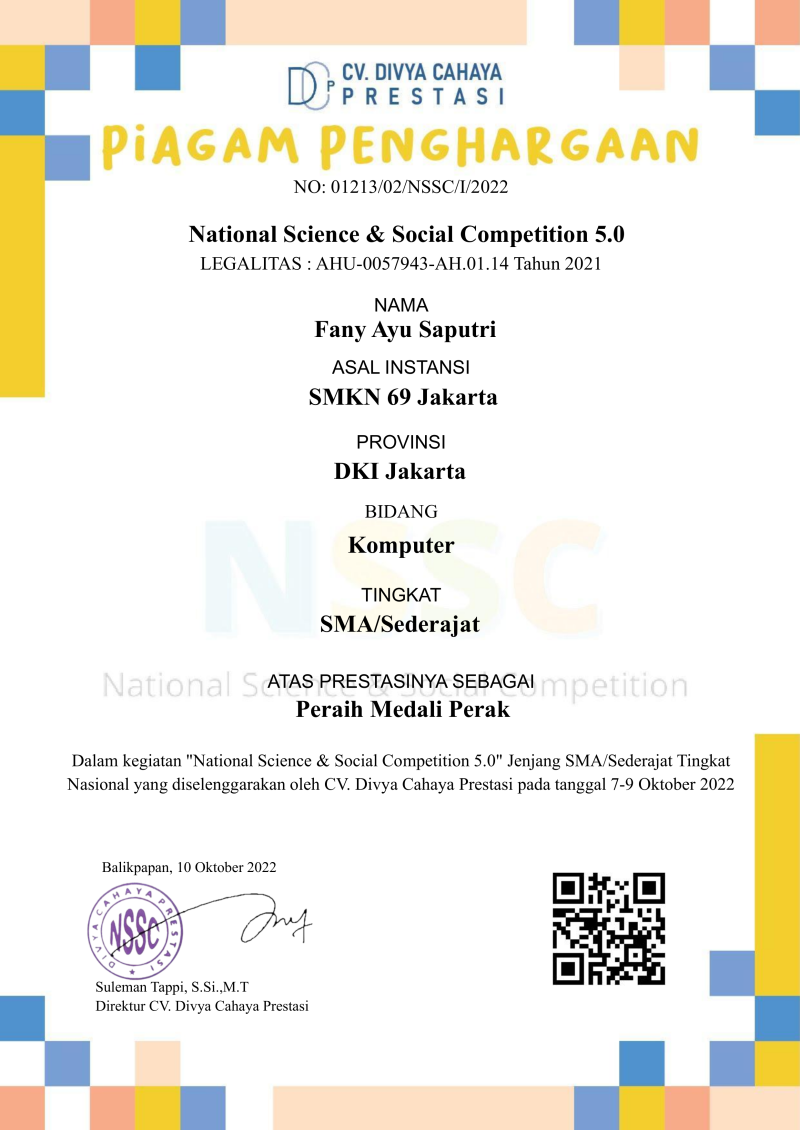 Selamat kepada ananda Fany Ayu Saputri atas penghargaan National Science & Social Competition 5.0" Jenjang SMA/Sederajat Tingkat