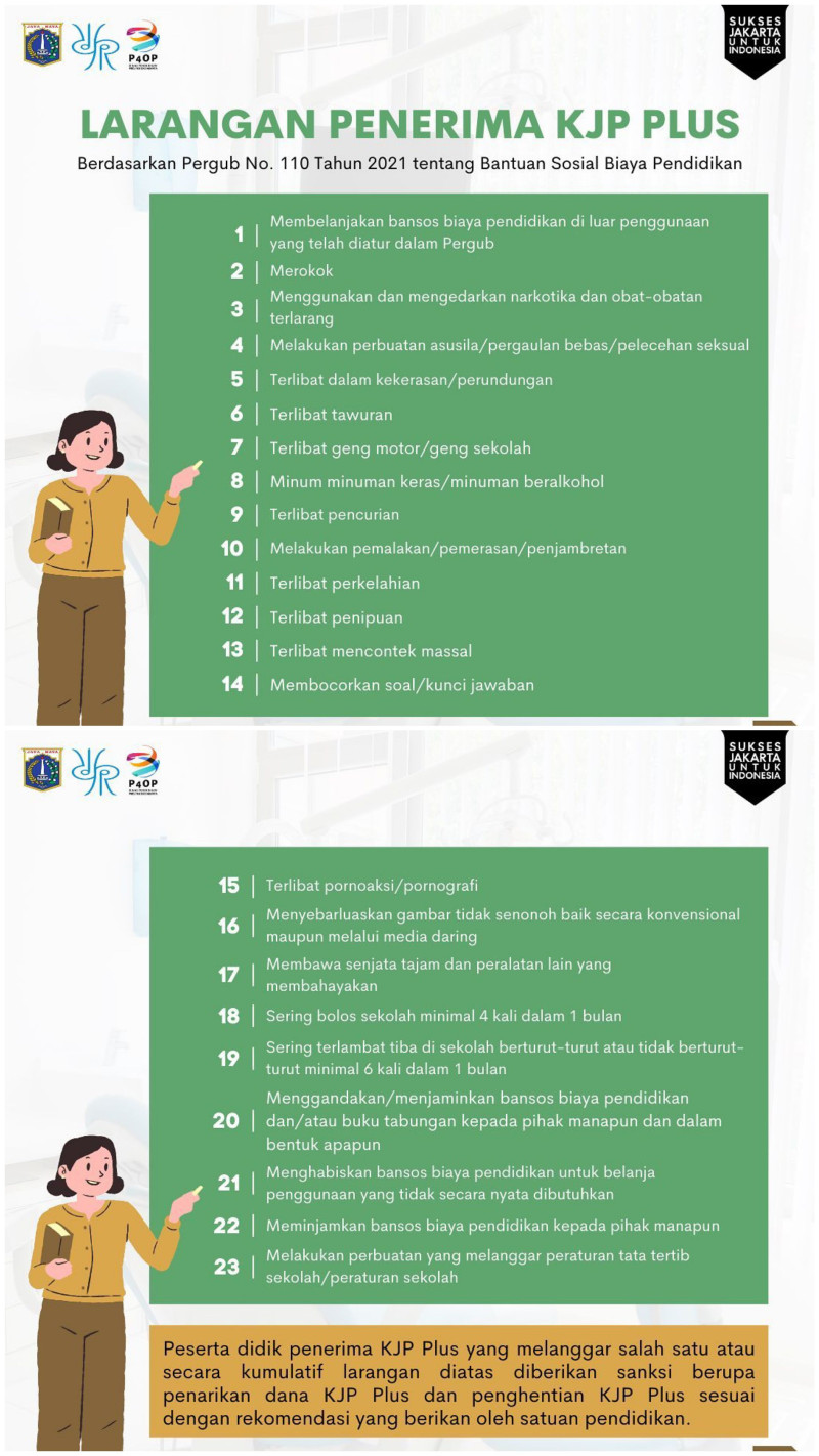 Berdasarkan Pergub No. 110 Tahun 2021 tentang Bantuan Sosial Biaya Pendidikan terdapat 23 larangan yang wajib dipatuhi oleh penerima KJP Plus.