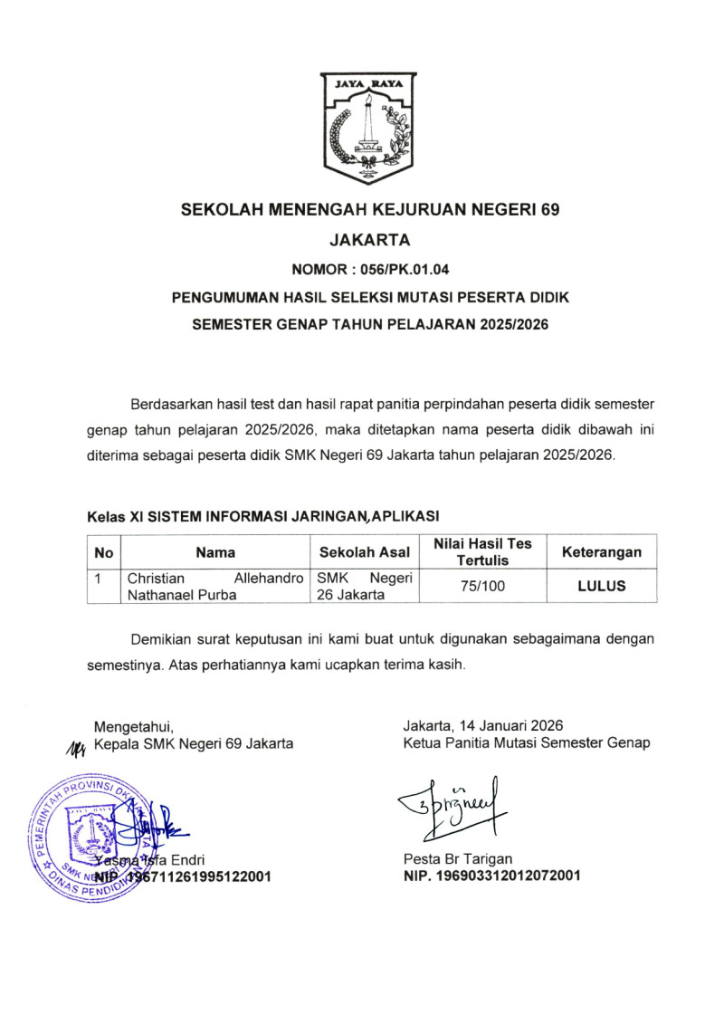 Pengumuman Perpindahan Peserta Didik Semester Genap TA 2025/2026